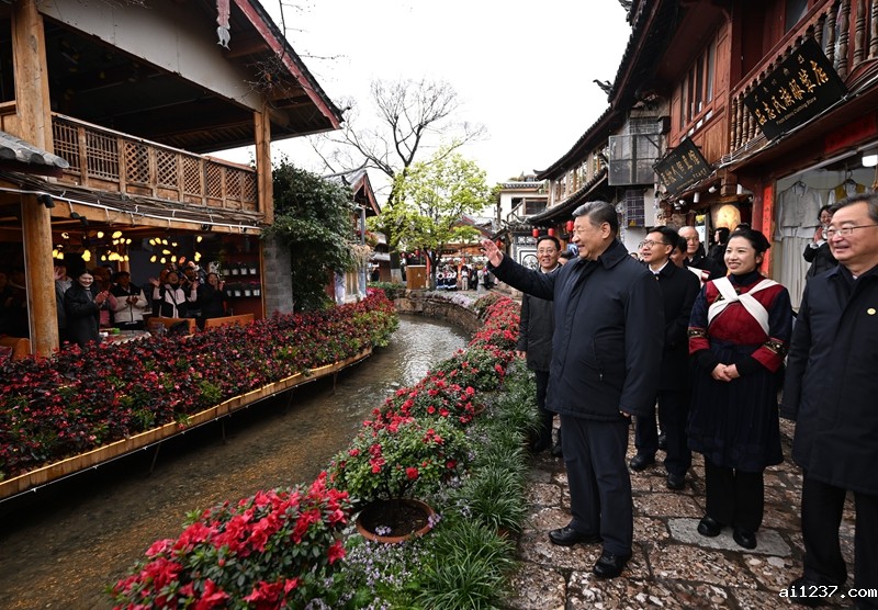 丽江古城有800多年历史,被列入世界文化遗产名录。一场春雪过后,丽江游人如织。习近平来到这里,详细了解古城营建历史、纳西族民居特色和当地文化遗产保护利用、推动文旅融合发展等情况。居民和游客见到总书记十分兴奋,争相问好,有的还弹奏乐器、载歌载舞欢迎总书记。习近平频频与大家互动交流,了解商铺经营状况和游客感受。他要求当地处理好保护和发展的关系,让这座美丽的古城焕发新的光彩。