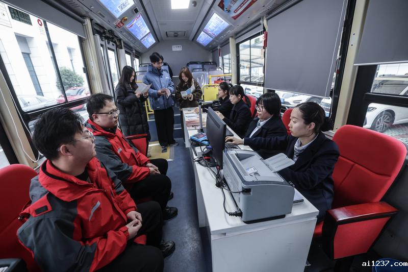 浙江省嘉兴市南湖区政务服务中心政务服务大篷车来到浙江凯乐士科技集团股份有限公司,企业员工在车上咨询社保、医保、人才等方面政策(2025年2月25日摄)。